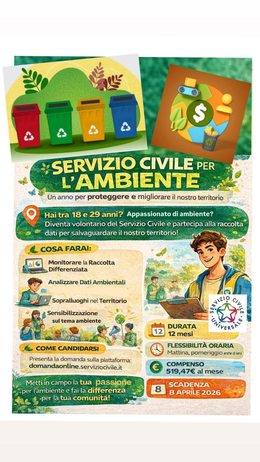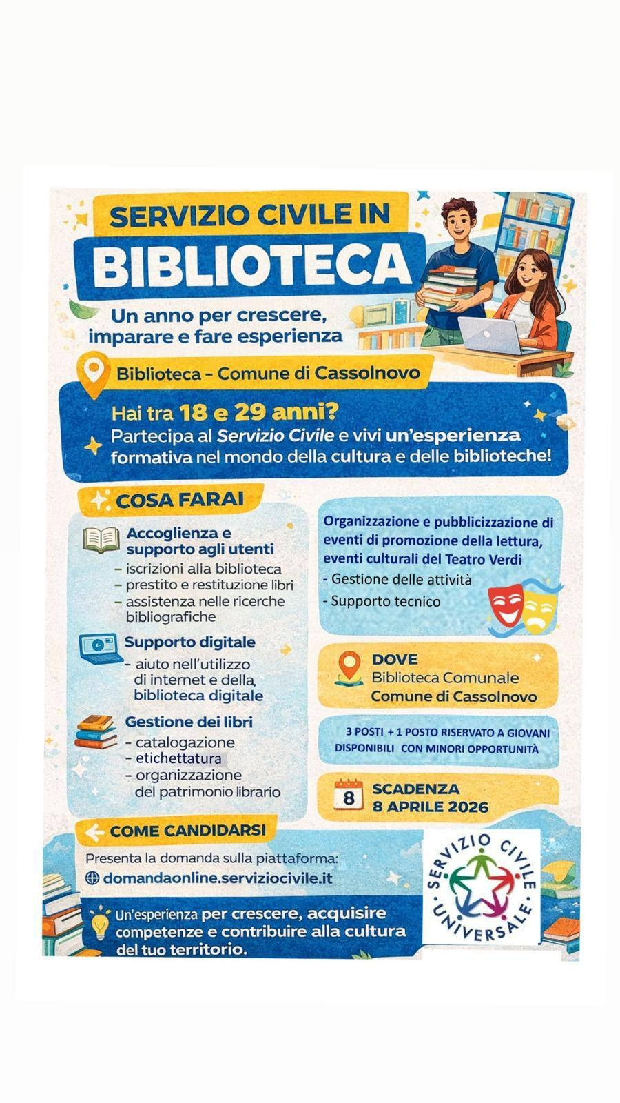 Si comunica ai gentili interessati, la pubblicazone del bando di concorso per il Servizio Civile Universale 2026 sul sito del Dipartimento per le Politiche Giovanili e il Servizio Civile Universale (https://www.politichegiovanili.gov.it/comunicazione/news/2026/2/bando-ordinario-2026/) e sul sito di SCANCI (www.scanci.it).