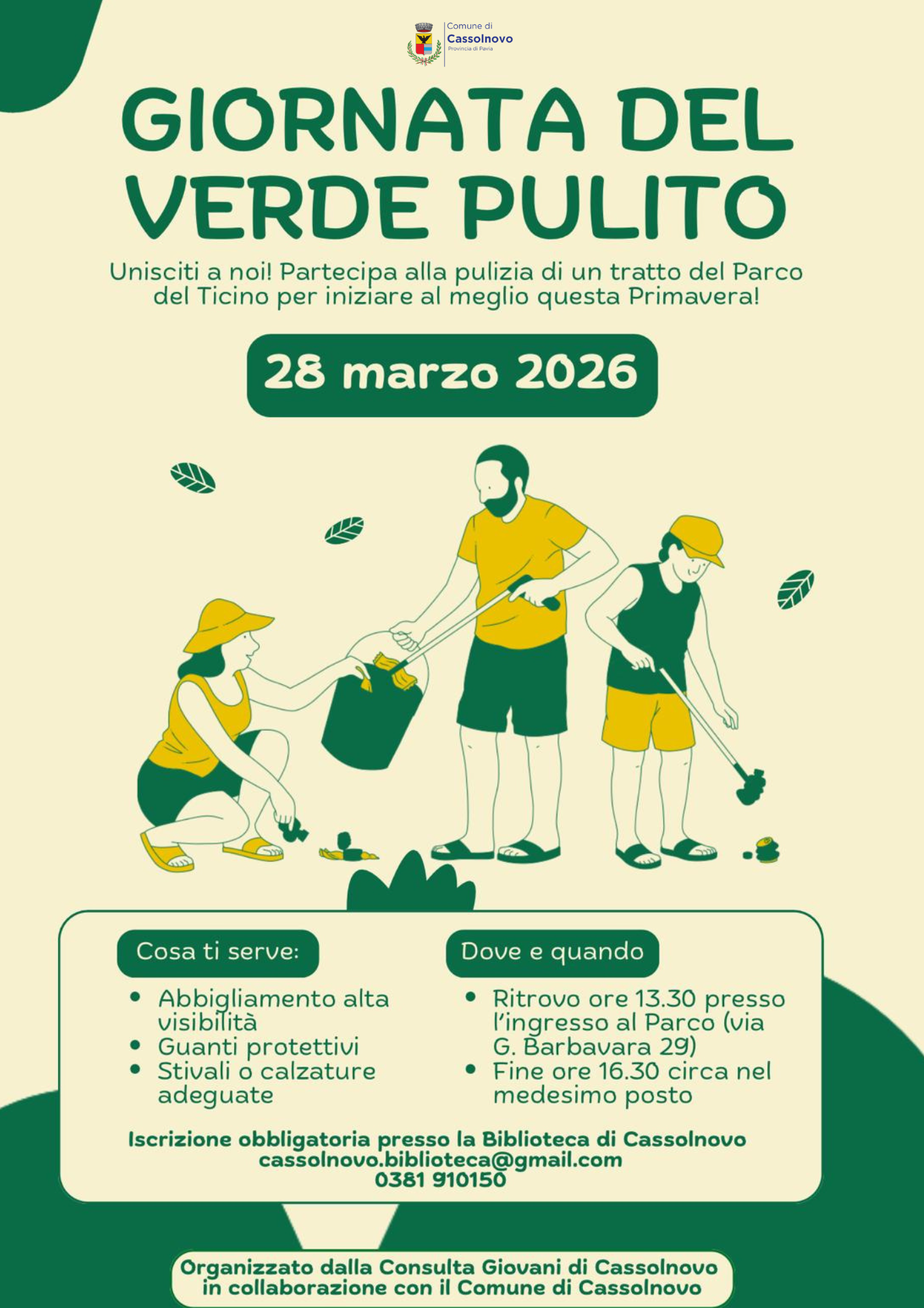 Il Comune di Cassolnovo organizza la “Giornata del Verde Pulito”, un’iniziativa dedicata alla cura e alla valorizzazione del territorio. L’evento si terrà il 28 marzo 2026 presso il Parco del Ticino e prevede la pulizia di un tratto del parco con la partecipazione dei cittadini.