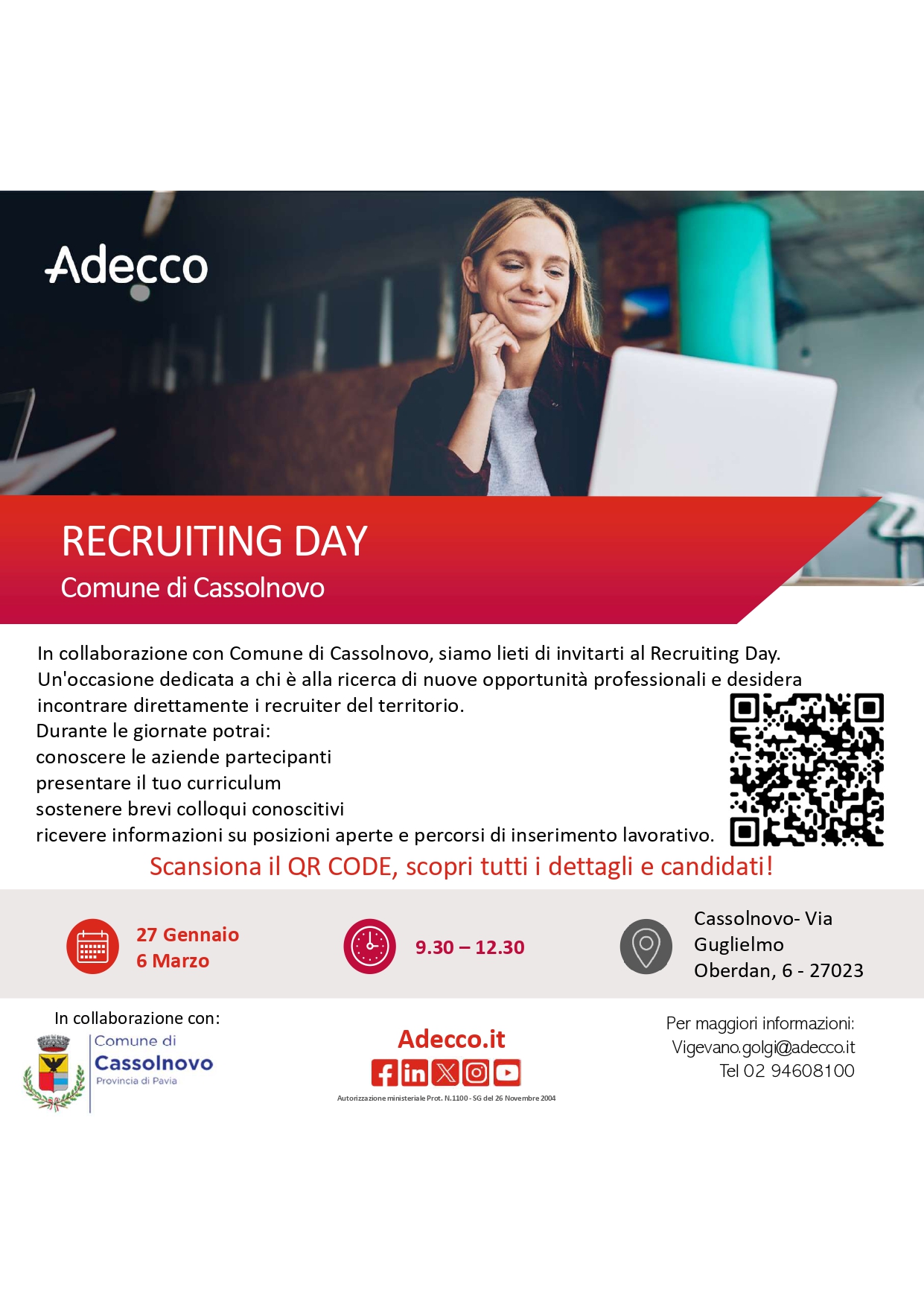 Evento Recruiting Day promosso da Adecco in collaborazione con il Comune di Cassolnovo, dedicato a chi è in cerca di nuove opportunità professionali. Un’occasione per incontrare direttamente i recruiter del territorio, conoscere le aziende partecipanti, consegnare il curriculum e sostenere brevi colloqui conoscitivi. L’iniziativa fornisce informazioni su posizioni aperte e percorsi di inserimento lavorativo, favorendo l’incontro diretto tra domanda e offerta di lavoro.
